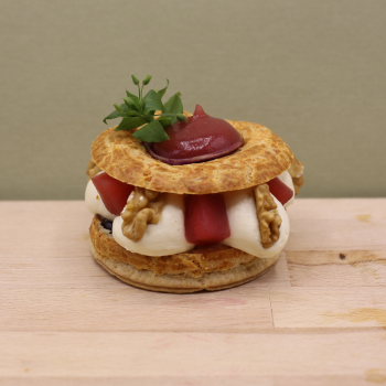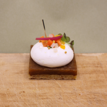 Pâte feuilletée au comté, crémeux comté, dés de pomme en pickles, noix