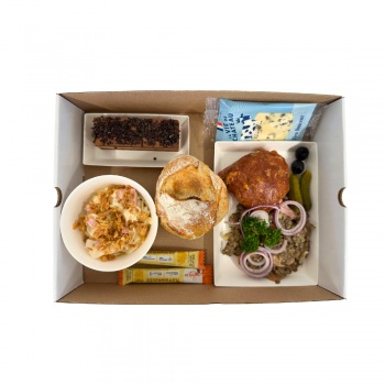 Salade de chou rouge et carottesFilet de poulet snacké aux épices, mayonnaise à la graine de moutarde et salade de céréales et muesliFromage du jourPâtisserie du jour ou fruit fraisPain18.50€ HT / PlateauA partir du 5 janvier 2026, les couverts et les verres ne seront plus inclus automatiquement.Ils seront disponibles en option lors de la commande:- couverts: 1,20€ HT- Verre: 0.30€ HT