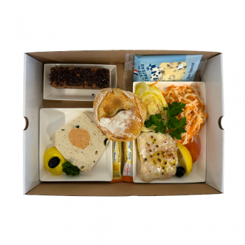 Pâté en croûte au saumon et petits légumes, sauce tartarePavé de cabillaud basse température, salade parmentière à l’œuf molletFromage du jourPâtisserie du jour ou fruit fraisPain21€ HT / plateauEvolution de l'emballage de nos plateaux repasDans une démarche de réduction du packaging et conformément à notre politique RSE, nos plateaux repas passent en format compact.A partir du 5 janvier, les couverts et les verres ne seront plus inclus automatiquement.Ils seront disponibles en option lors de la commande:- couverts: 1,20€ HT- Verre: 0.30€ HT