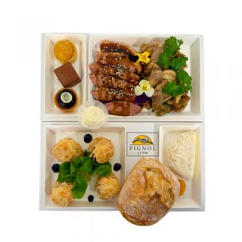 Chouquettes de foie gras et confit de pommes aciduléFilet de canette rôti au miel, champignons des bois et éclats de châtaignes en saladeFromage du jourPâtisserie du jour ou fruit fraisPain26,50€ HT / plateauEvolution du packaging de nos plateaux repas