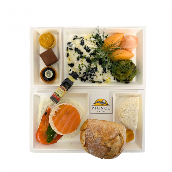 Le "Baltik" au crabe et saumon fumé, crème safranéeFilet de Saint-Pierre, vinaigrette au yuzu, quenelles de patate douce, effluves de gingembre, salade de wakaméFromage du jourPâtisserie du jour ou fruit fraisPain26,50€ HT / plateauEvolution du packaging de nos plateaux repas