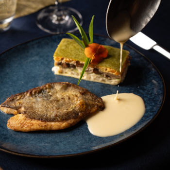 Filet de Saint-Pierre rôti, lasagnes de légumes (céleri, butternut et champignons), sauce champagne