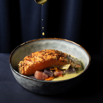 Saumon mi-cuit au fumoir, poêlée de légumes d'hiver (crosnes, duo de carottes, betteraves Chioggia, radis Blue Meat, rutabagas et butternut), sauce cresson