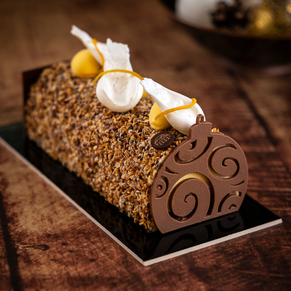 Sorbet et confit mandarine, éclats de noisette, croustillant et biscuit chocolat, meringue