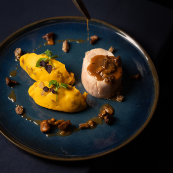 Ballotine de chapon au foie gras, crémeux de butternut, éclats de châtaigne et sauce forestière