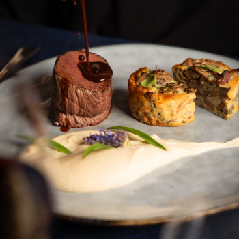 Dos de cerf, sauce au poivre du Costa Rica, clafoutis de champignons et crémeux de céleri
