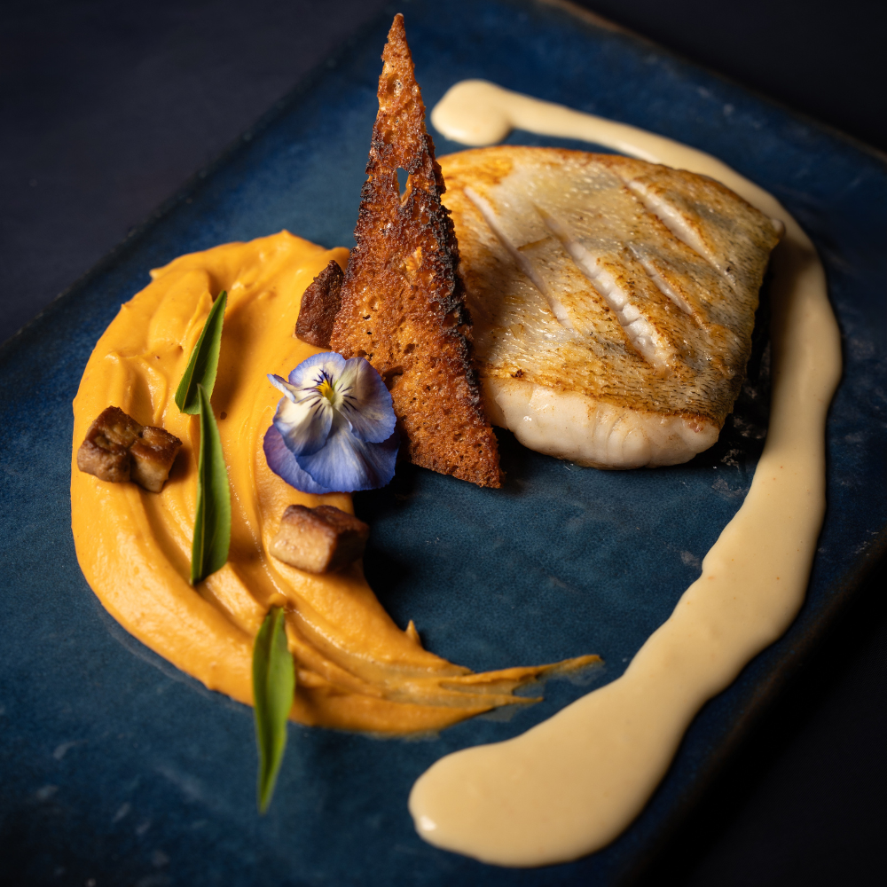 Dos de sandre, purée de patate douce parfumée au pain d'épices, sauce Jurançon et dés de foie gras